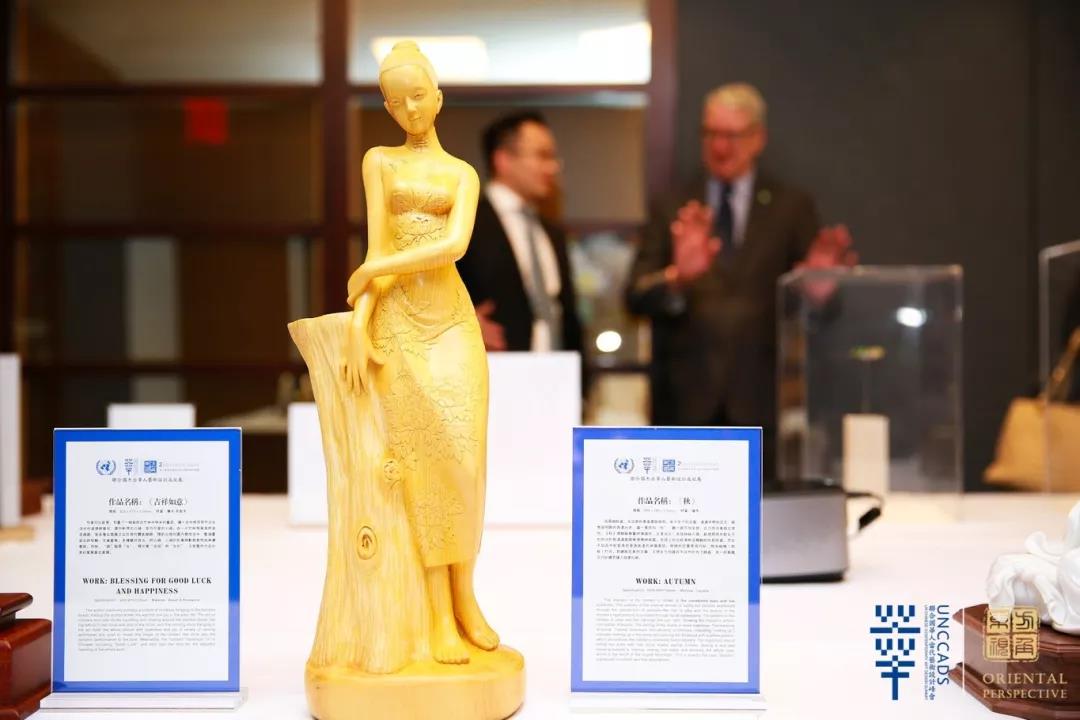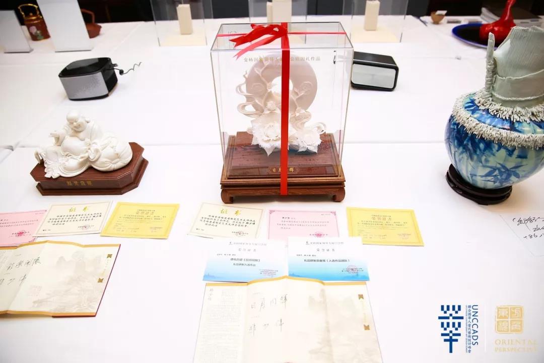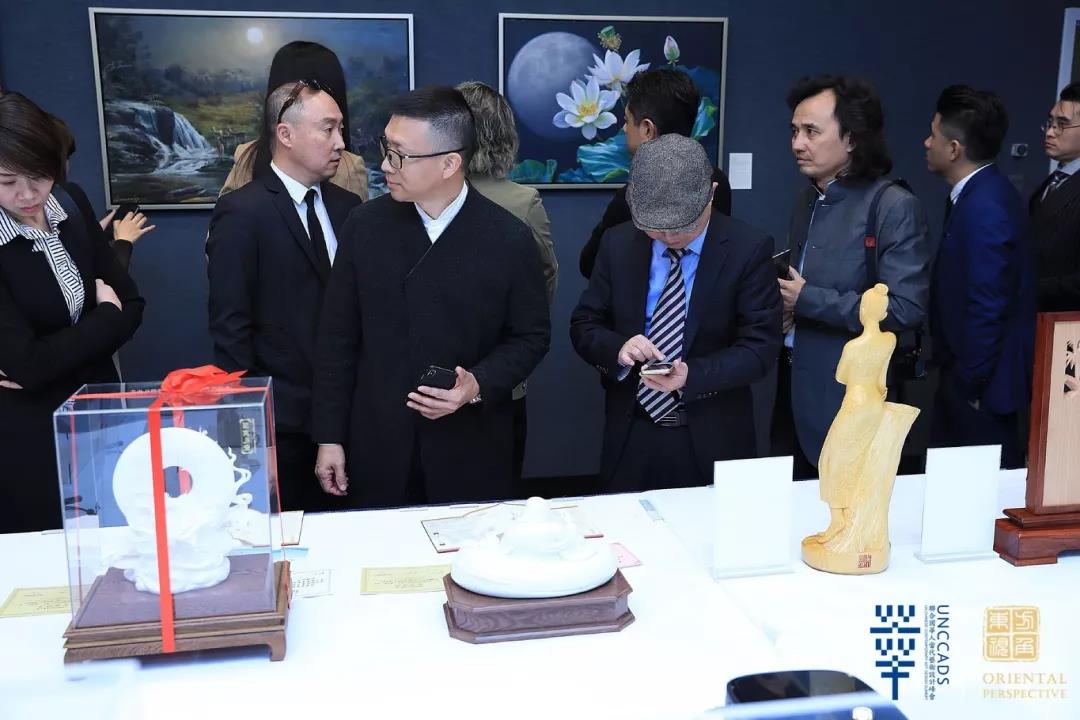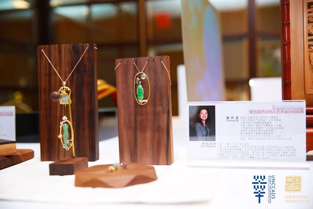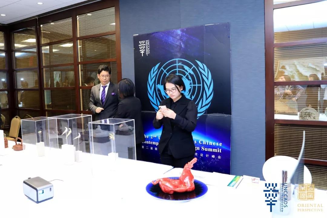 晚宴上,還展出了曾獲得過世界級設計大獎的藝術設計師作品,包括書畫、工藝美術、攝影、非遺藝術、平面設計、建筑設計、室內設計、軟裝設計、服裝設計、珠寶設計、工業設計等領域的百幅杰作,登頂聯合國舞臺,向世界展示東方設計美學。