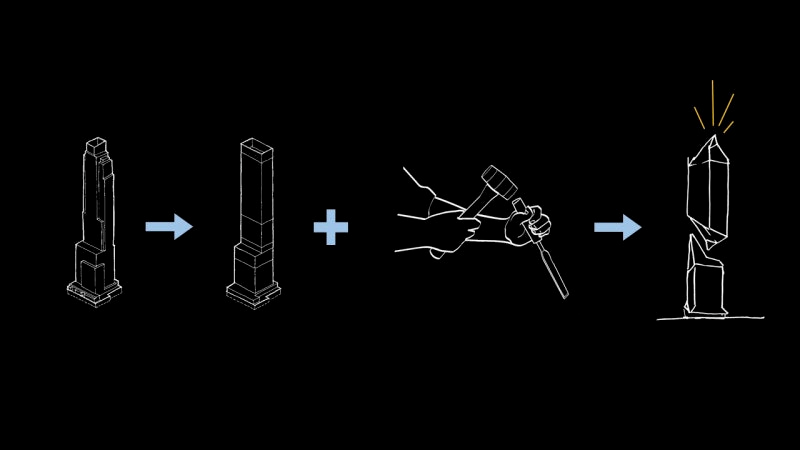 建筑的形態并非簡單的垂直堆疊,而是通過“鑿刻”手法,將建筑體量分割為上下兩部分,形成動態的視覺層次。