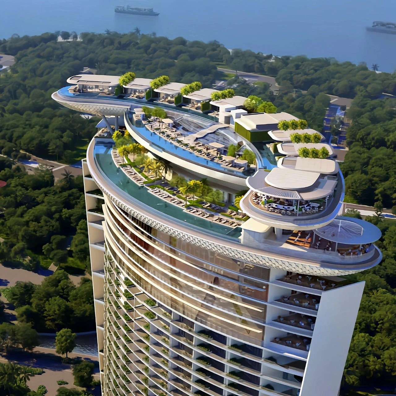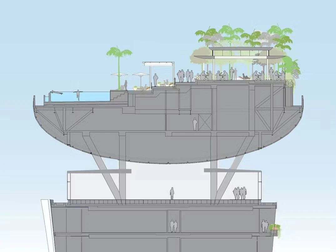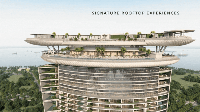 螺旋雙環設計,一面是城市天際線,一面是馬六甲海峽,實現全角度沉浸。