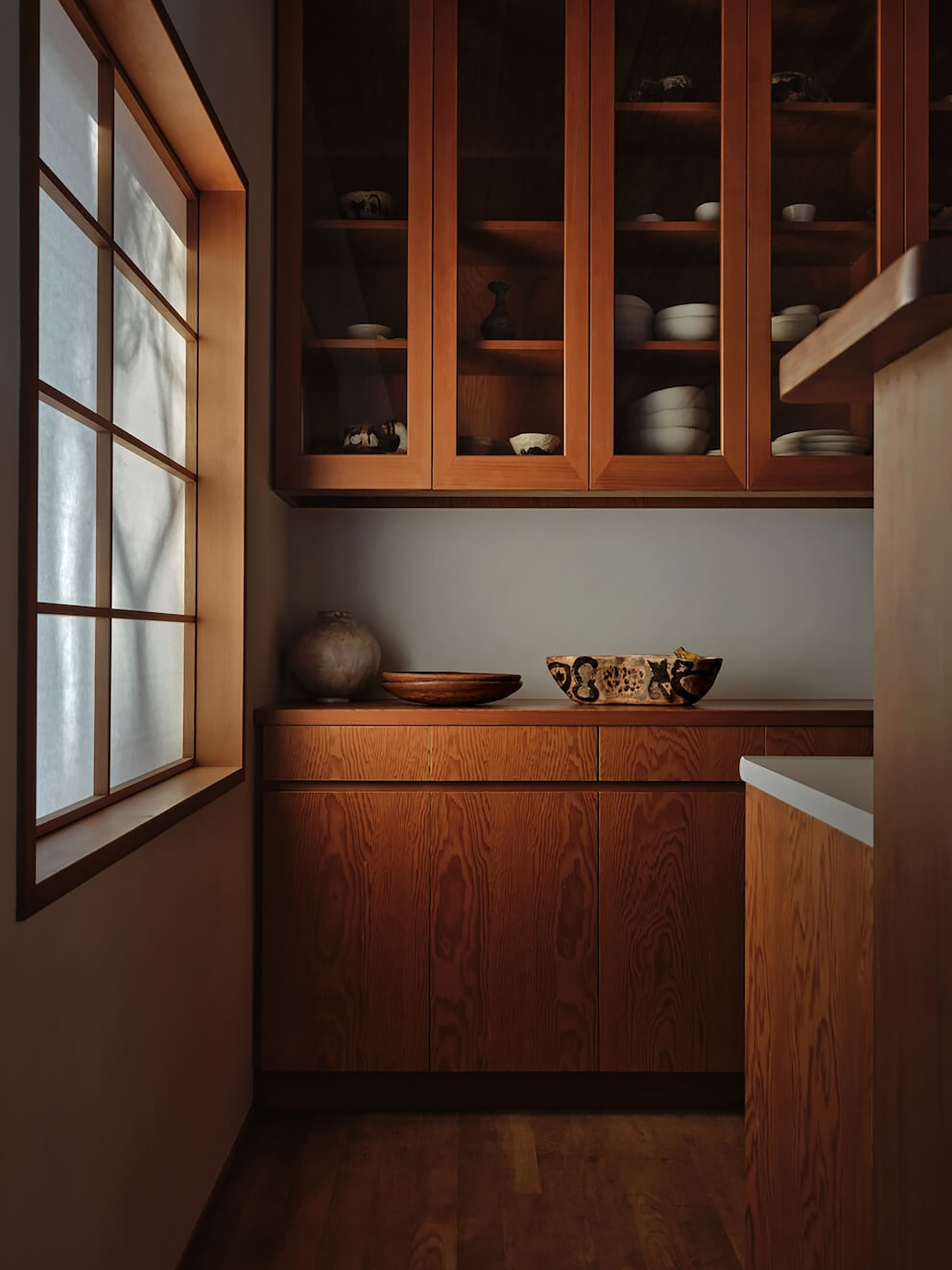 大面積落地窗引入柔和的自然光,光線在木紋與石材上流動,形成靜謐的光影敘事,仿佛時間在空間中緩慢呼吸。